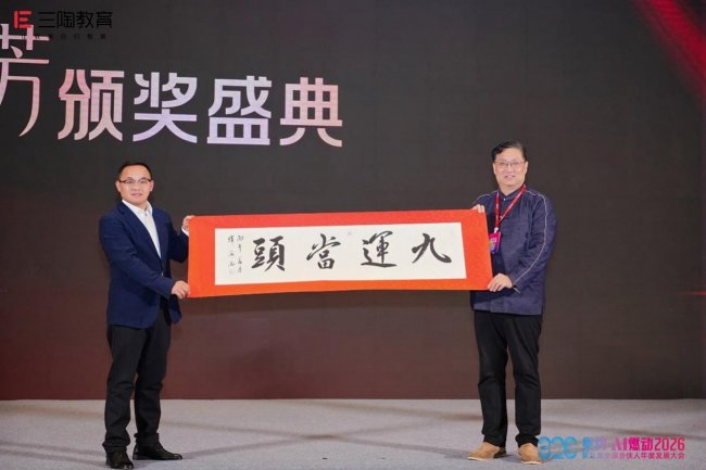 大会现场,民办教育培训行业资深财务专家谭海忠赠予 “九运当头” 墨宝,为三陶教育九周年盛典送上鸿运祝福。